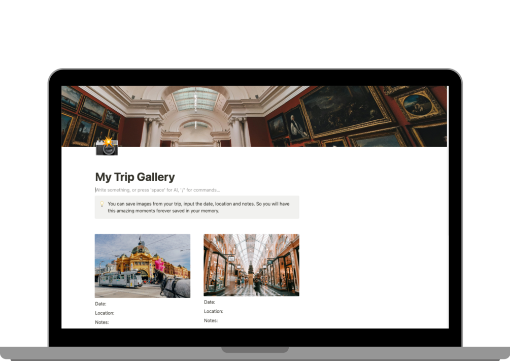 - Travel Gallery Template: Relive your best moments. Store and showcase your favorite travel photos in a beautifully organized gallery, creating a visual diary of your adventures.