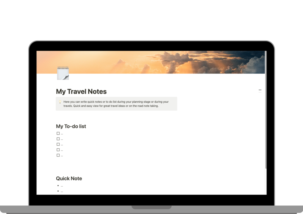 This bundle includes 1 ready-to-use travel dashboard with 4 sub-templates to eliminate the need to set up your Notion from scratch.