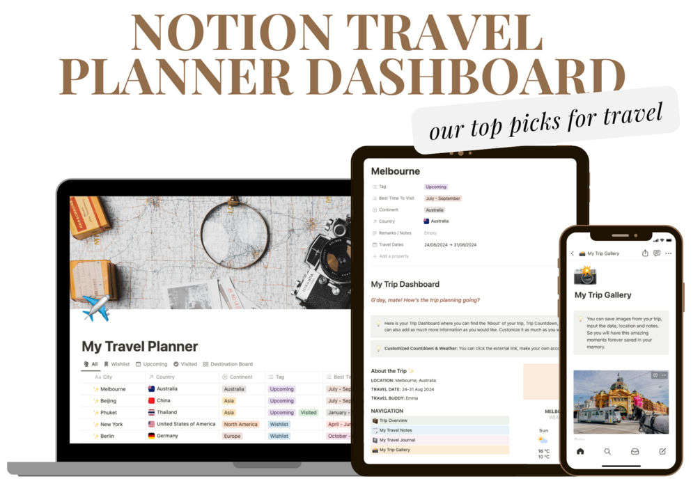 Plan your travels effortlessly with our Notion Travel Planner Dashboard! Experience tracking your destinations, setting countdowns, viewing weather forecasts, and keeping all your trip details, notes, and memories in one place. Perfect for all travelers, this Notion template makes planning simple and fun!