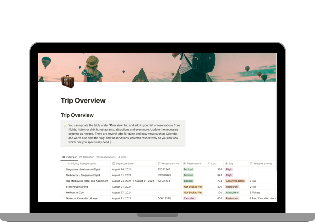 - Trip Overview Template: Get a birdโs-eye view of your entire trip. Organize your itinerary, key details, and travel plans in one streamlined dashboard for easy access and stress-free planning.